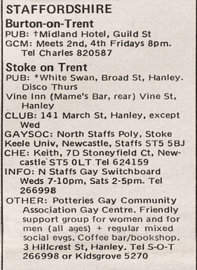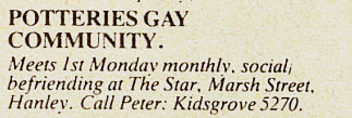 If you want more information about the Potteries Gay Community Association, you can ring the following contacts (all on Stoke-on-Trent numbers): Sue, 814205; Barbara, 611217; Mark, 618831; Dale, 23975; the North Staffordshire Gay Switchboard, 625416 (Weds, 7-10pm only).