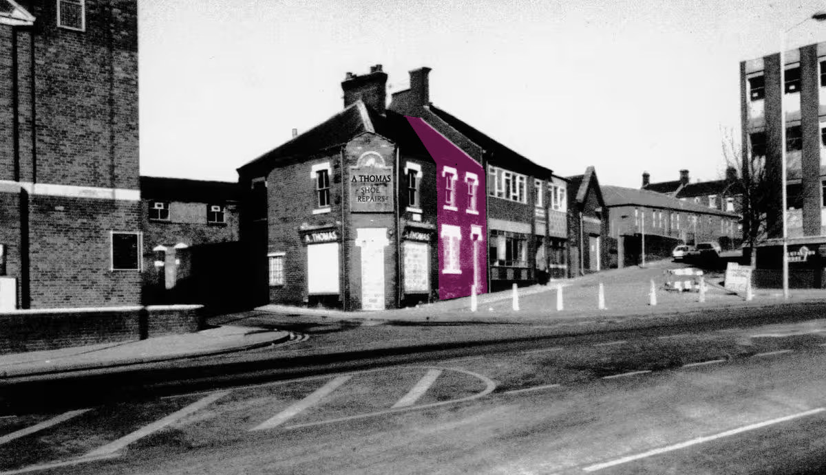 The end of Hillcrest Street in 1985 prior to demolition works. The Gay Centre is the terraced house highlighted in pink. (Adapted from a photo sent to the Evening Sentinel by Thomas Jones, of Meir)