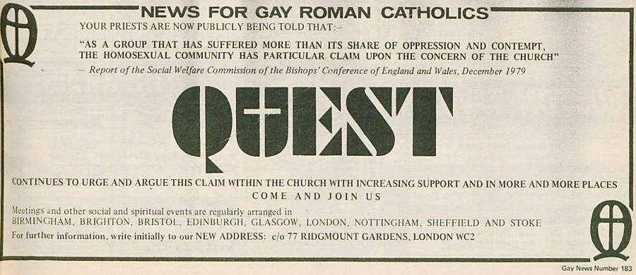 Quest was a national group  that emerged in the 1970s to support gay (and later lesbian, bi, trans, etc.) Roman Catholics and to engage the Church on pastoral care. It built a national network of regional groups including meetings held in Stoke-on-Trent, the first having taken place in 1977.