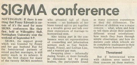 SIGMA, was a national support group founded by Penny Edwands and her gay husband Ray for the heterosexual partners of mixed gay/heterosexual marriages. In 1979 they held their national conference in Nottingham (Gay News 20 September 1979)